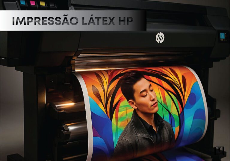 Impressão de vinil em uma plotter látex da HP, que oferece alta resolução, cores vivas e excelente resistência, sendo perfeita para adesivos, comunicação visual, rótulos e decoração.